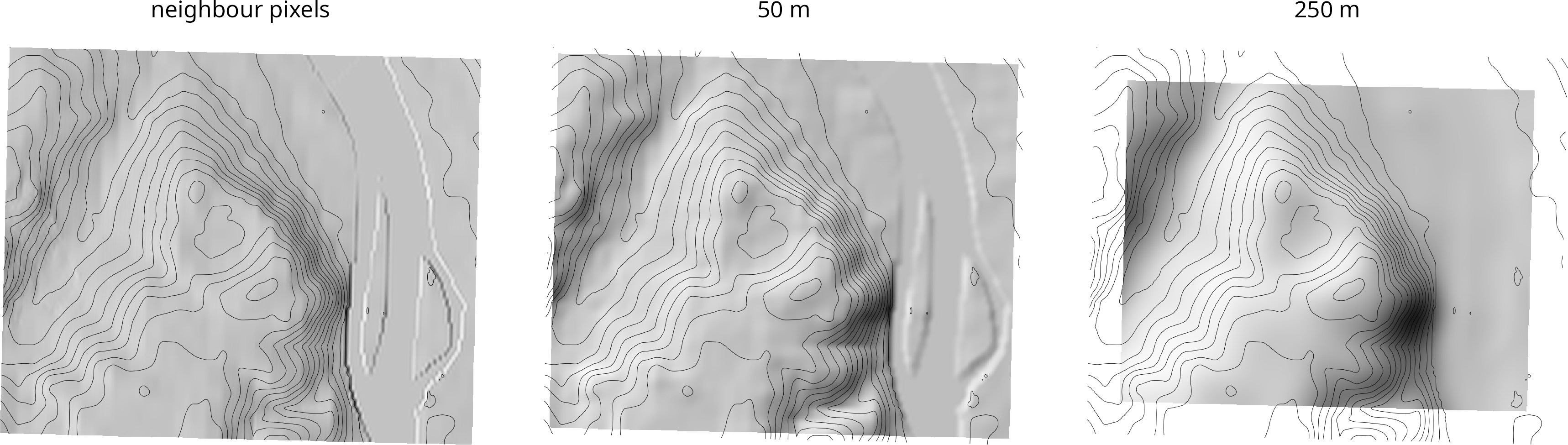 The Rodderberg, located on the opposite side of the Rhine River from the Siebengebirge, is an inactive volcano. Although its last eruption was 250,000 years ago, the crater can still be seen in the landscape today. Here, I used my own procedure to contrast the elevations of the south-east and north-west quarters of a circular window. I modified the radius and compared the results with those obtained using the standard procedure of considering only the eight neighbouring pixels in a DEM.