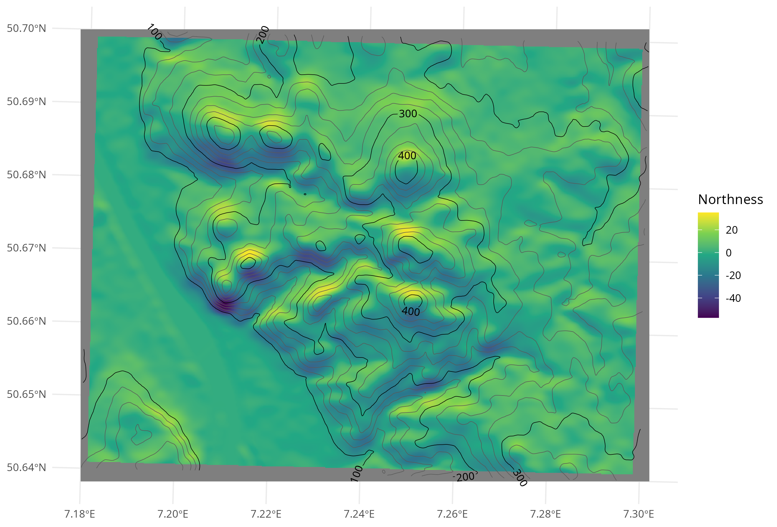 Northness estimated by the difference in mean elevation towards south minus towards north. The location is the Siebengebirge in Germany. Contour lines show the elevation in m asl.
