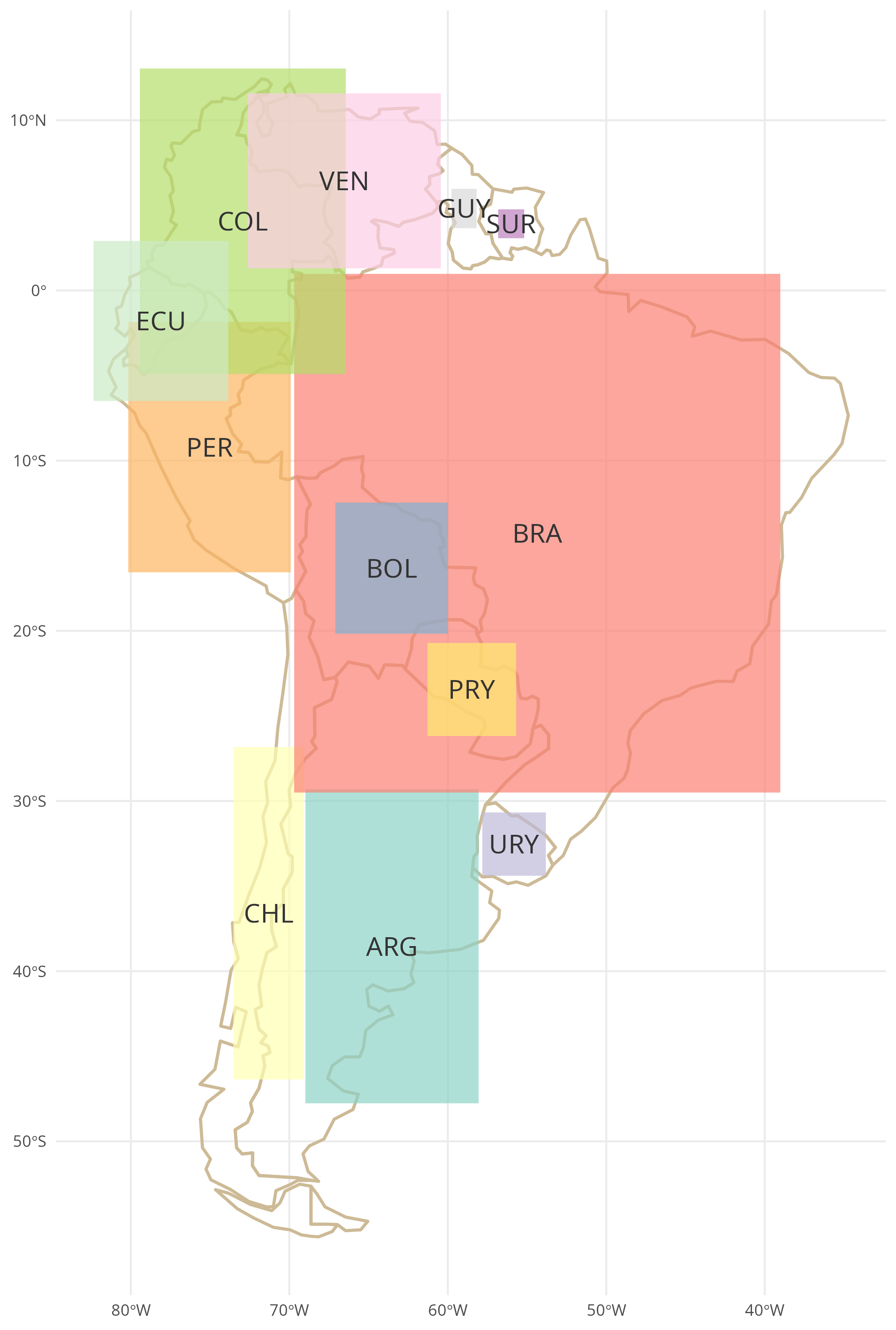 The population size of the South American countries is represented by the area of the rectangles. The centroid and aspect ratio of each rectangle are preserved from the bounding boxes of the respective polygons in the background.