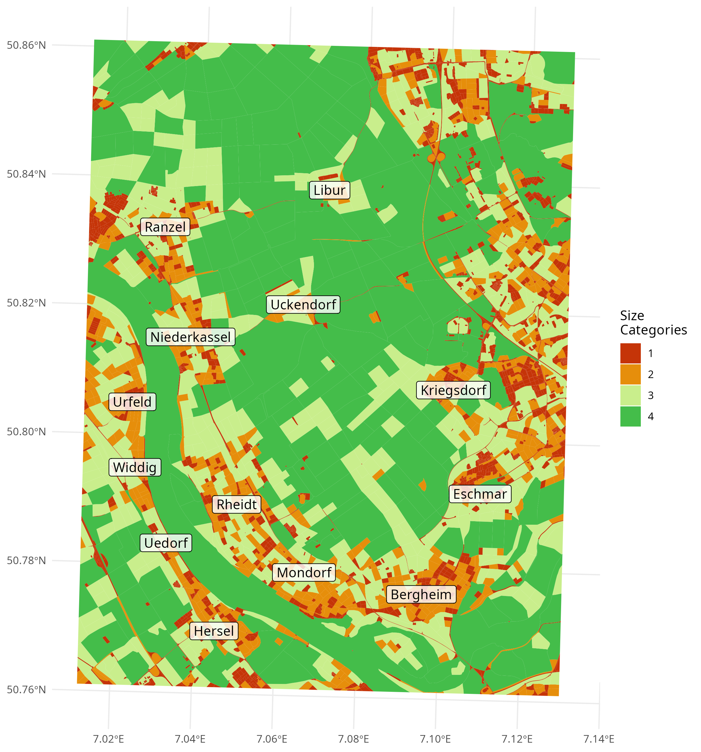 The area is divided into blocks using the highway feature from OpenStreetMap. Blocks are classified primarily by size. Small blocks are expected to indicate urban areas.