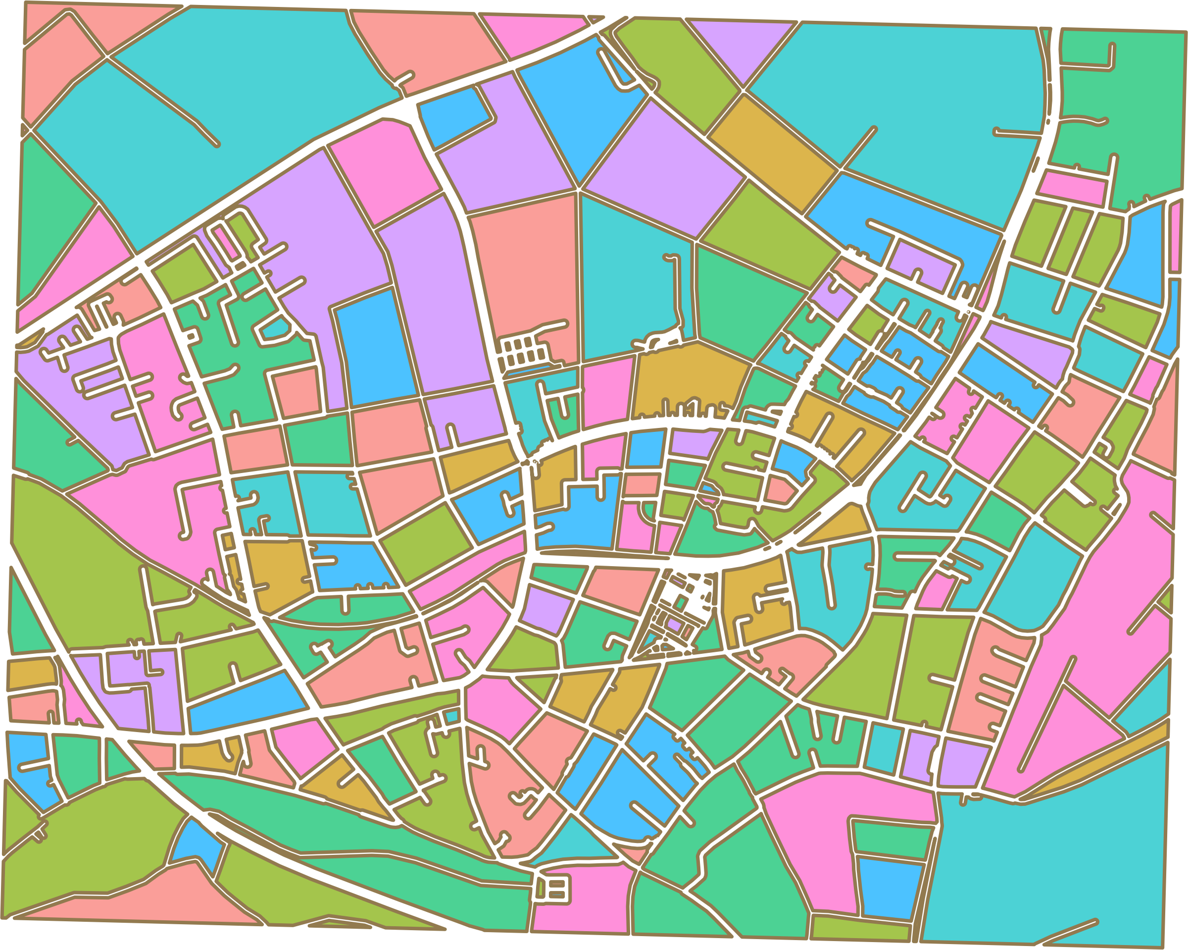 I am attempting an artistic display of road networks by using buffers according to road categories and assigning random colors to the polygons between roads. The area includes Bergheim and Müllekoven (Troisdorf), where I currently live.