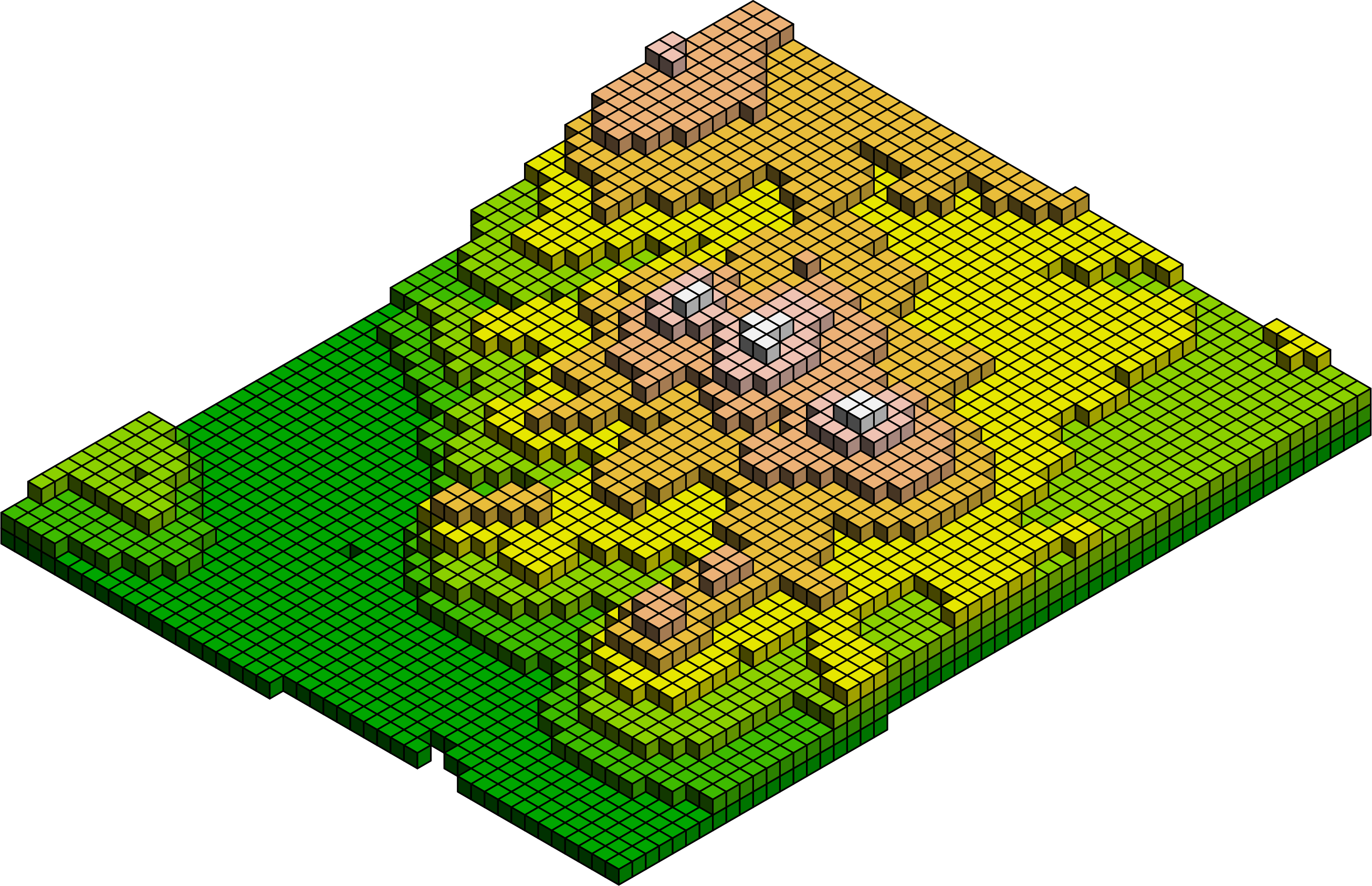 The elevation model was constructed with isocubes. The model represents the Siebengebirge in Germany (see this map). Each cube has a surface area of 150 meters by 150 meters, and the height represents an elevation of 50 meters.
