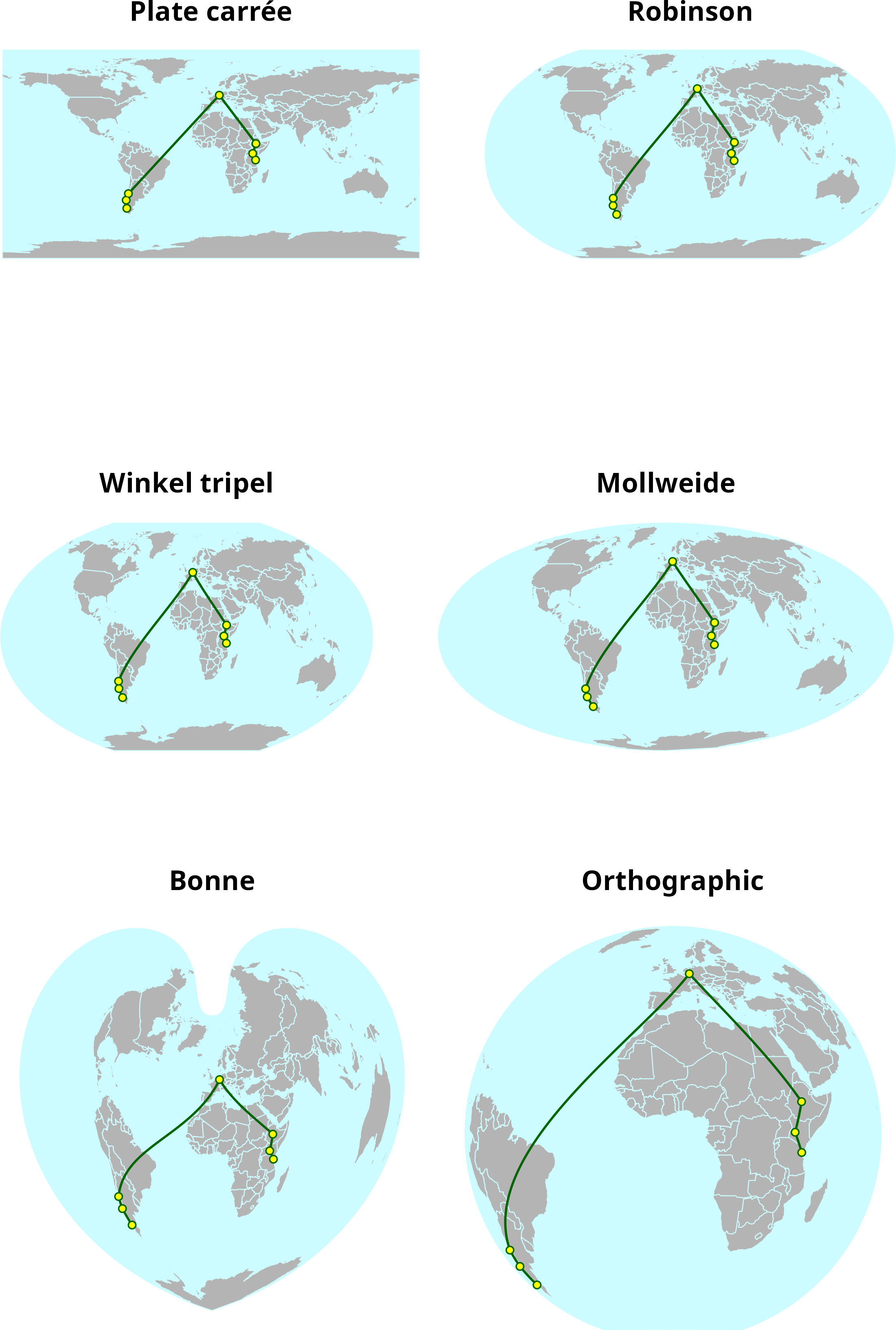 A line connecting the most important stations of my life around the world, displayed in six different projections.