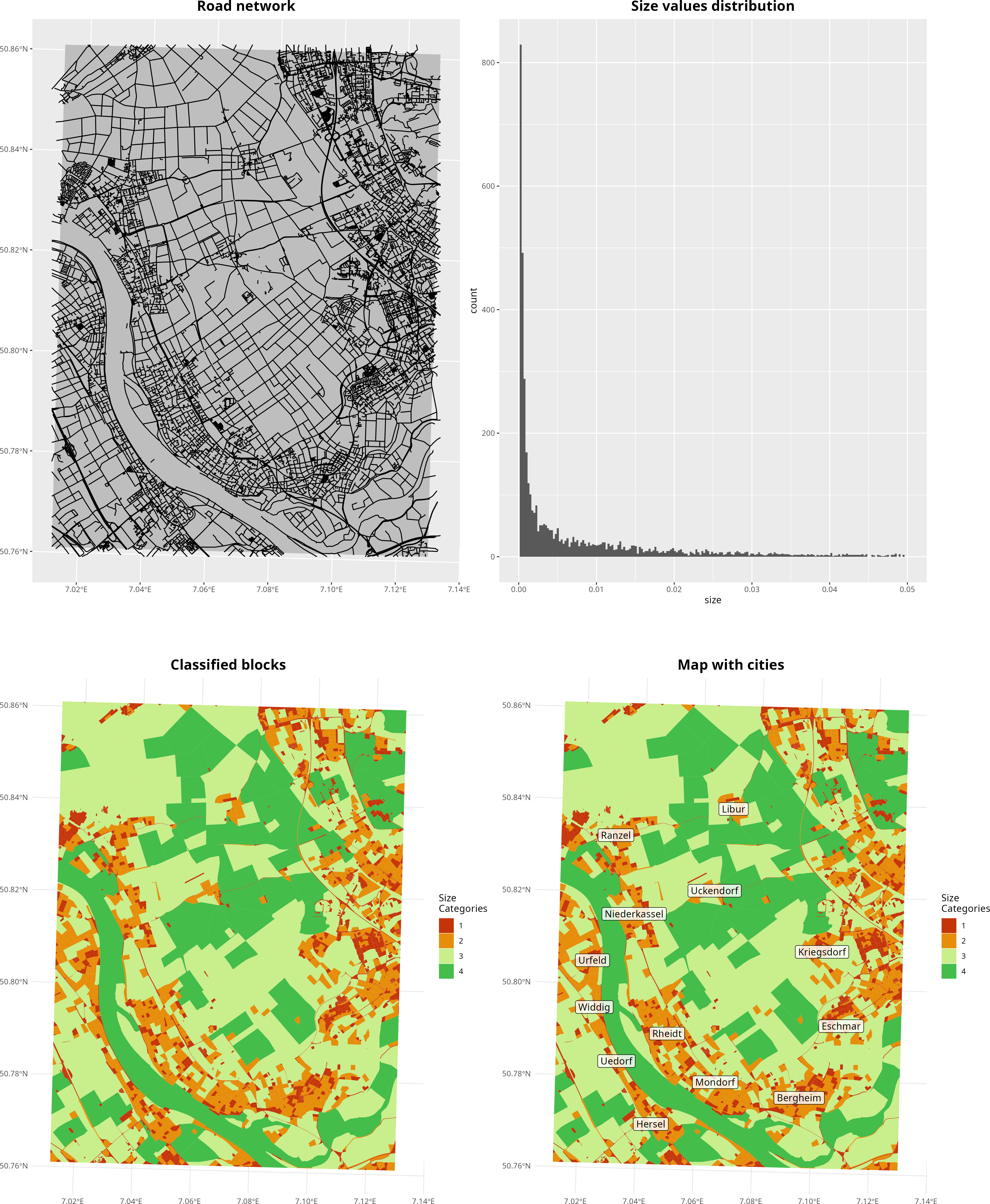 The making of map 8. The process begins with exploring the raw data downloaded from OpenSteetMap. The roads are used to split the background into polygons, and the distribution of size values is examined. Finally, the results are displayed and cities are added to validate the results.
