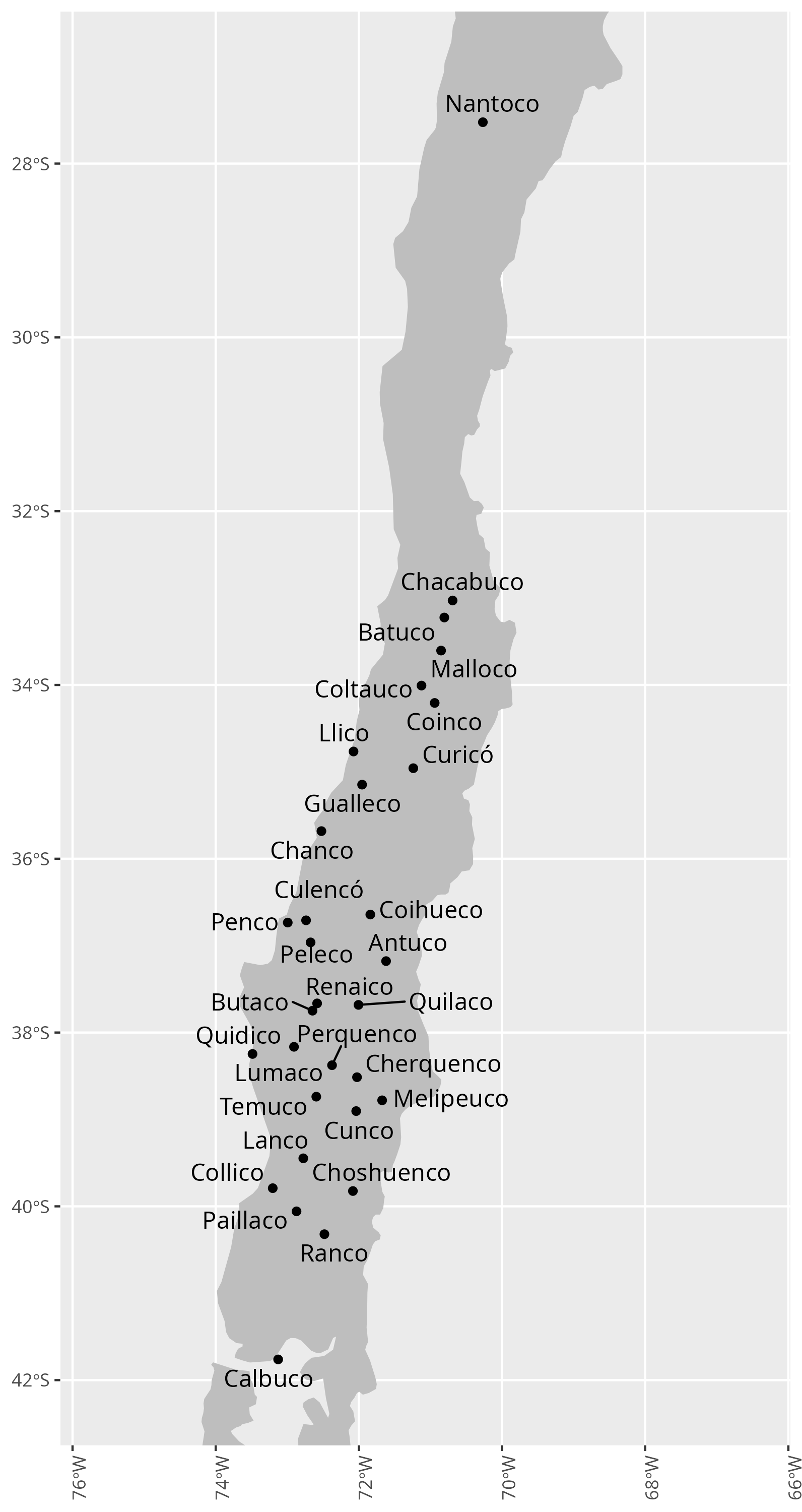 In Mapudungun, the language of the Mapuche people, ko means water. As a suffix in Chilean toponymy, it is related to streams or wetlands. Here is a preliminary collection of such names. Note that the outlier Nantoco was named by Mapuches who migrated to this place as mineworkers.