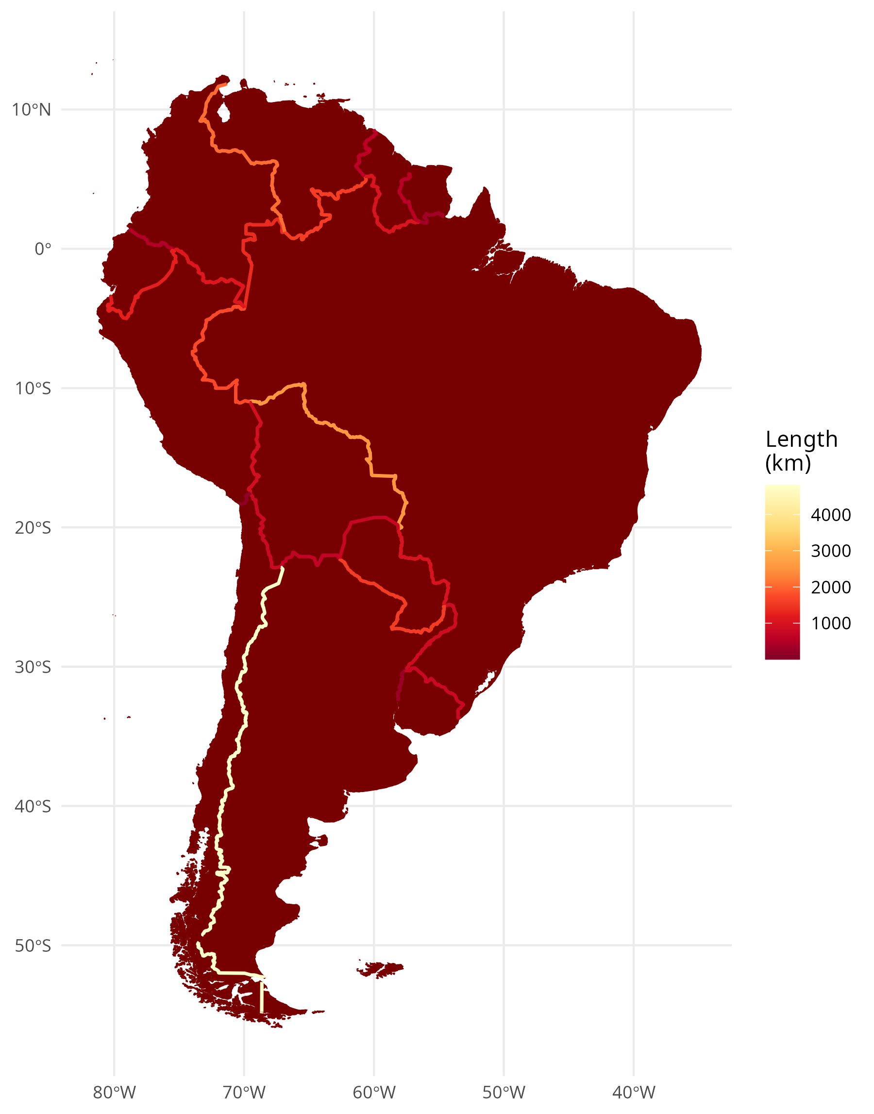 Borderlines between South American countries. Coloured according to their extent.
